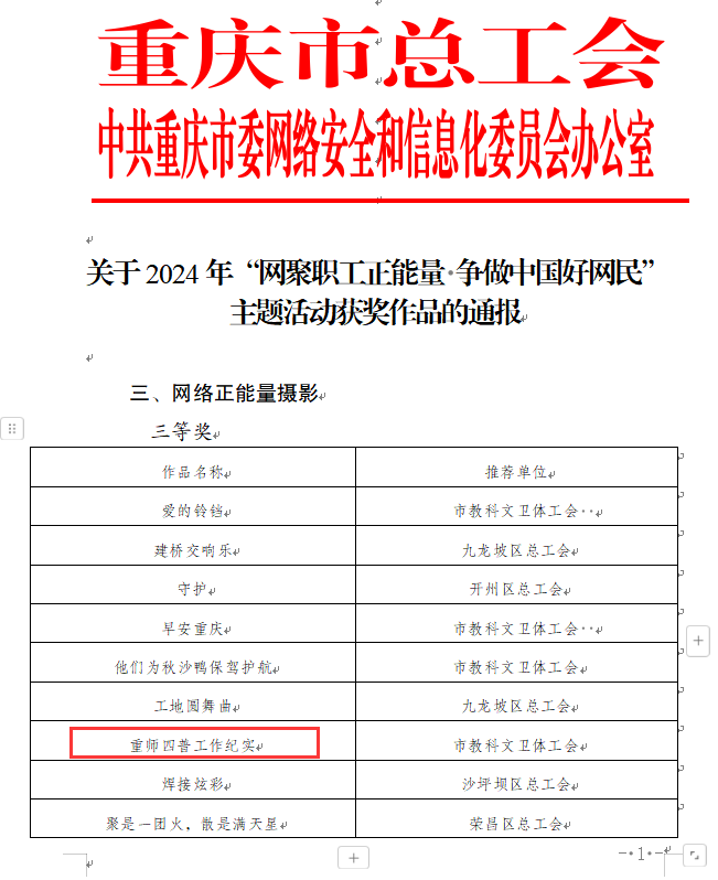 近日,在重庆市总工会、中共重庆市委网络安全和信息化委员会办公室发布的“关于2024年‘网聚职工正能量 争做中国好网民’主题活动获奖作品的通报”中,m88选送的作品《信仰的力量》(机关一工会、音乐学院工会)、《重师四普工作纪实》(历史与社会学院工会)分别荣获诵读作品二等奖、摄影作品三等奖。