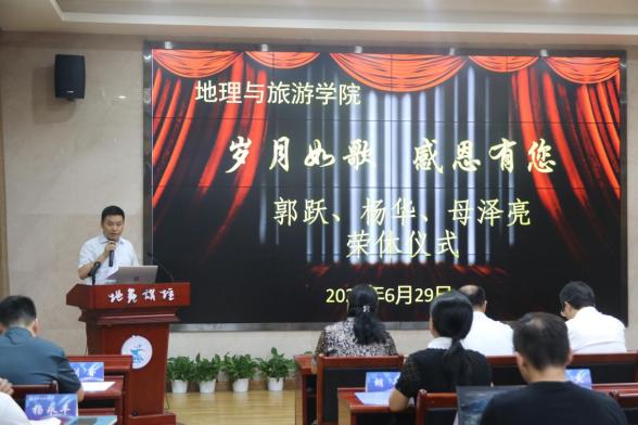 6月29日下午,致用楼117室内喜气洋洋,情谊浓浓,我院为光荣退休的郭跃老师、杨华老师和母泽亮老师举行荣休仪式。学校孟小军副校长,人事处吴佳贵副处长,工会刘涛副主席,及学院党政领导、全体教职员工齐聚一堂,热烈欢送三位老师光荣退休。荣休仪式由学院党委胡芳书记主持。